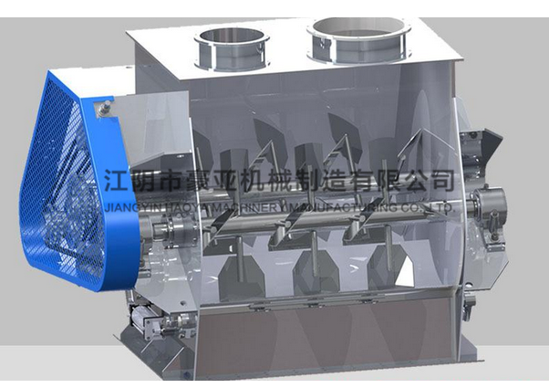双轴桨叶式混合机具有混合均匀度高,无混合死角;混合周期短,排料迅速,无残留,出料门密封可靠,无漏料现象;每批混合量可变范围大;出料控制采用气动形式;噪音低,无粉尘等特点。
